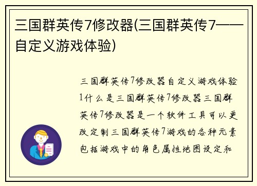 三国群英传7修改器(三国群英传7——自定义游戏体验)